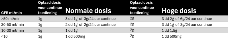 CAV / VVHD: Continue venoveneuze hemodialyse/hemo(dia)filtratie: normale aanvangsdosis, gevolgd door 1 g 1 dd. Bij peri-operatieve profylaxe gedurende 24 uur is aanpassen van de dosering niet nodig.